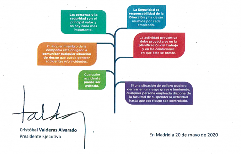 La dirección de la Compañía establece que todo trabajo debe ejecutarse de forma segura. Si una situación de peligro pudiera derivar en un riesgo grave e inminente, cualquier persona empleada dispone de la facultad de suspender la actividad hasta que ese riesgo sea controlado.